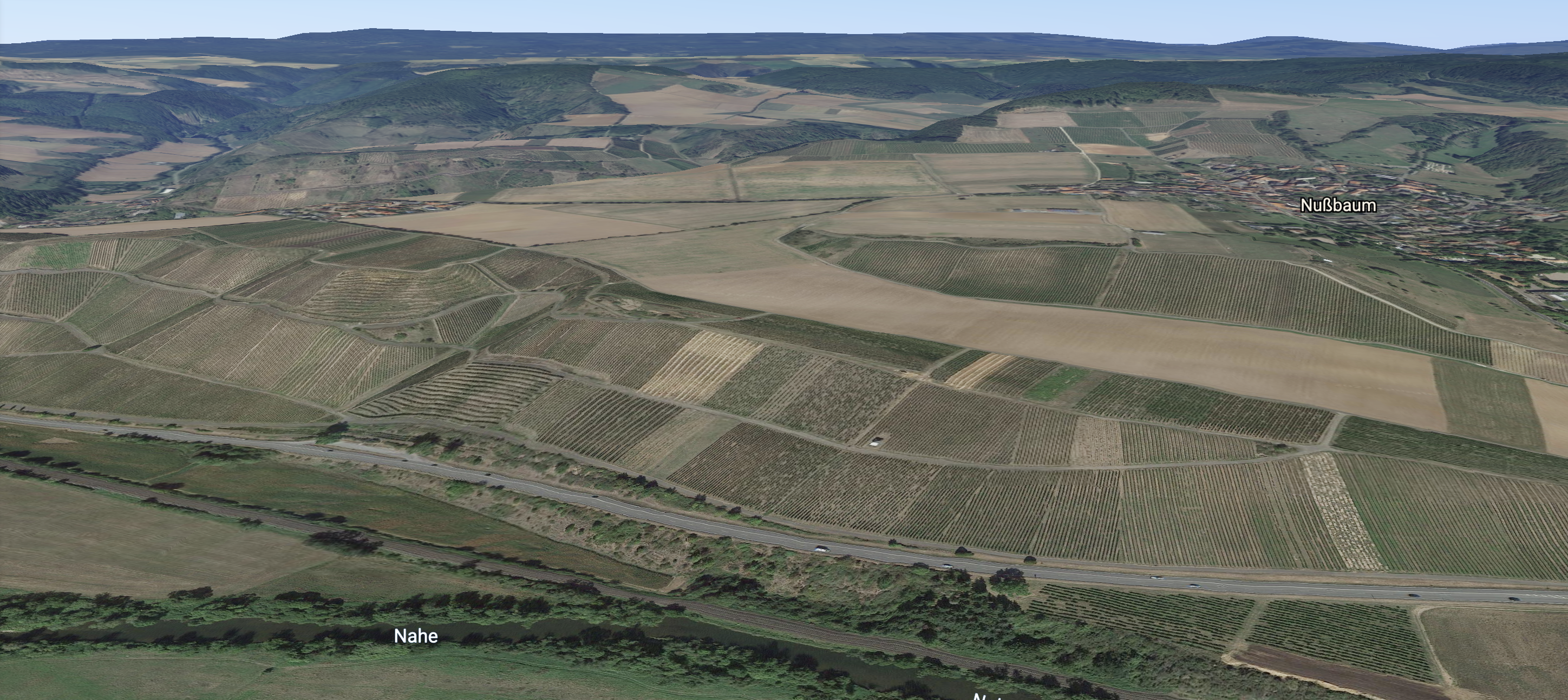 Beginning with the 1971 wine law when many vineyards were reorganized, the Frühlingsplätzchen was expanded to include not only the historical area west of Monzingen village (the left side in the map above), but also for the first time incorporated a section of vines east of the village (the right side) surrounding Auf der Ley and Halenberg, which were never historically a part of Frühlingsplätzchen. You can see this area on the above map in the lower right-hand corner, where Frühlingsplätzchen picks up east of Halenberg and where the pink outlined Niederberg is now indicated.