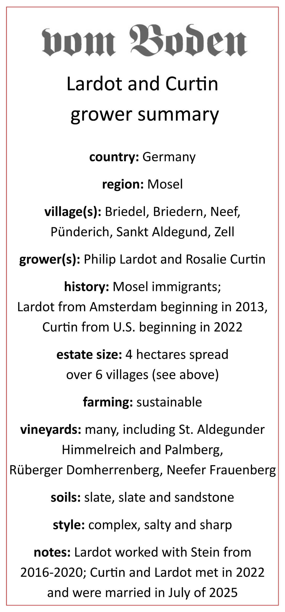 The longer story is, of course, a bit more complicated, eventually becoming a love story involving another American (Rosalie Curtin) who would move to the Mosel in 2022 to work with Lardot, who would eventually marry him, start her own line of wines and then, most likely, move them all under one label.
