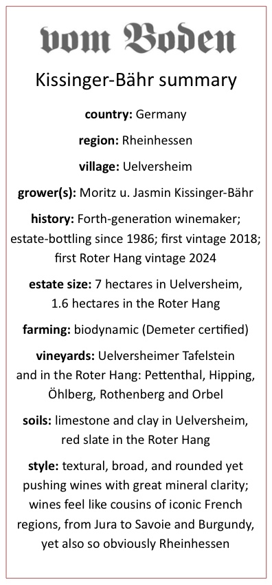 Moritz and Jasmin Kissinger-Bähr (and Carsten Saalwächter up in the north of the Rheinhessen) represent for me the two most-realized growers of this “new Rheinhessen.” I’ve been tasting with both estates for years at this point, impressed by their freshman vintages, by the first wines they put into bottle… and now, only a few years later, slack-jawed and oftentimes honestly dumbfounded by how ****ing good these wines are.