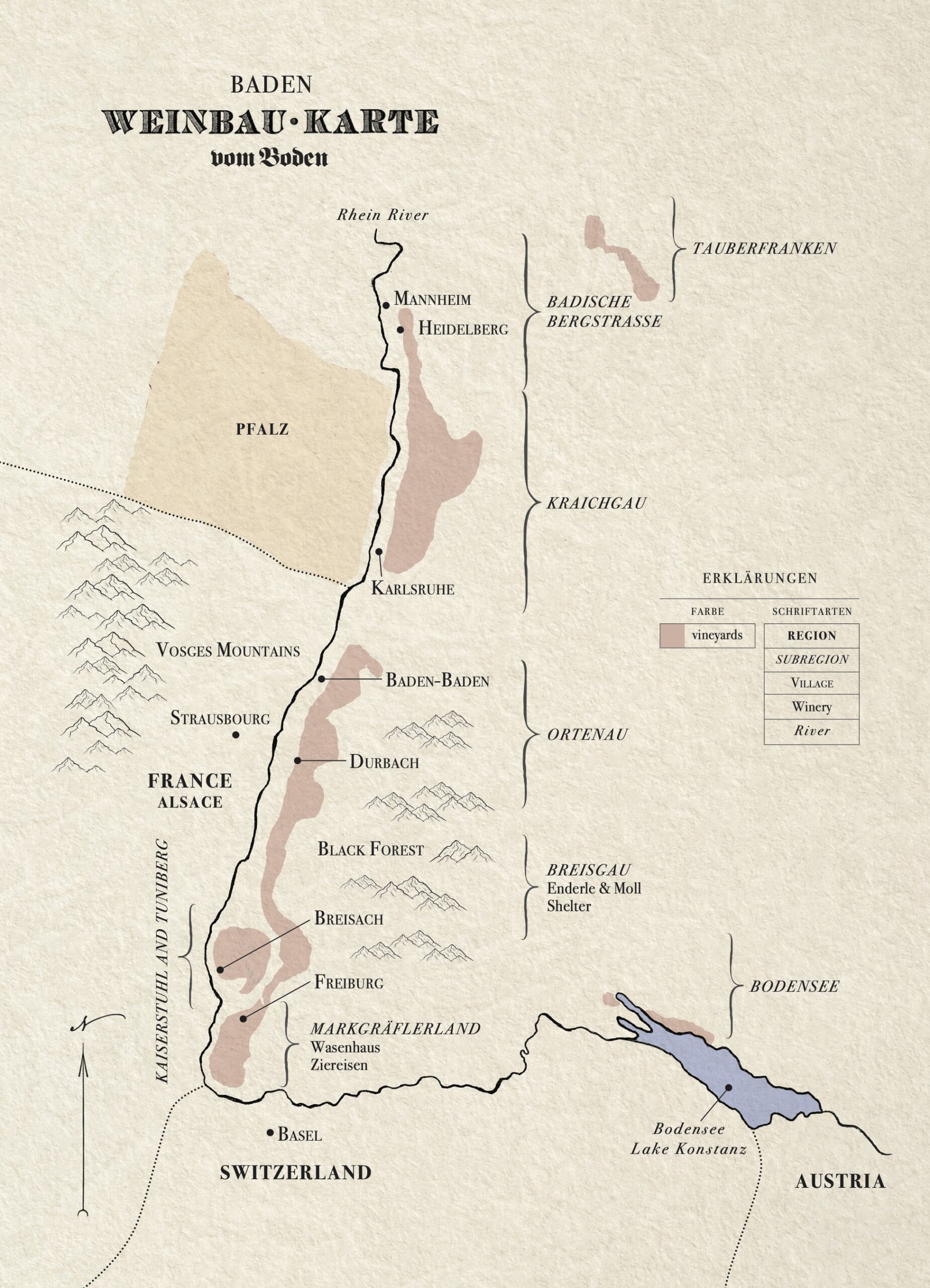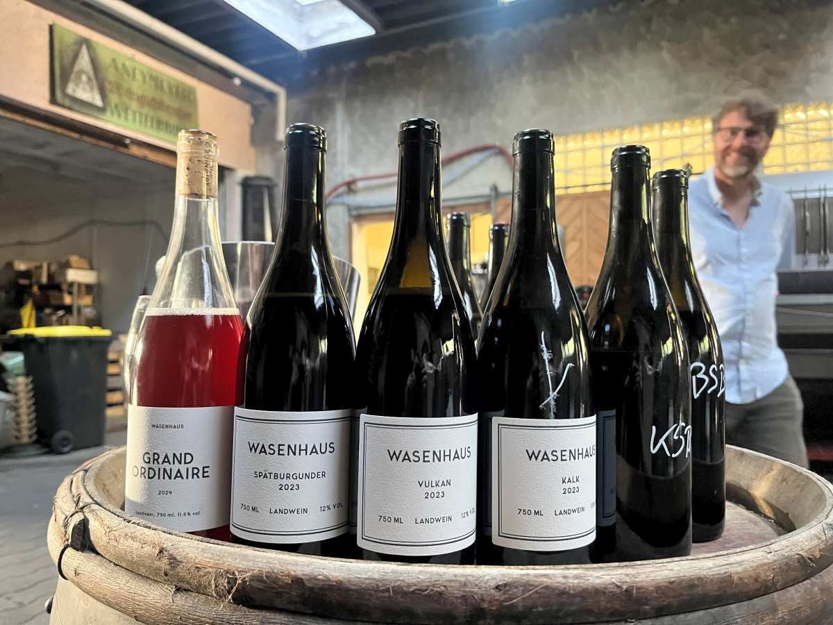 The focus at Wasenhaus (thus named after the farm that Christoph grew up at, focusing on horses and not wine) is old vines, old clones, and in general curious parcels that dot the landscape of southern Baden (the to the right is a general map of Baden; the map lower down in the right-hand column, illegible until you click it, gives you details of their holdings around Ehrenkirchen). Alex and Christoph seek out vineyards that have been ignored because they are too hard to work, because the yields are too low, or for whatever quirky reason. The great majority of their holdings come from near Ehrenstetten though they do have holdings in villages a touch north (Ebringen) and a touch south (Zunzingen). They also farm a few parcels in the Kaiserstuhl, an area maybe forty minutes north and west; all these grapes go into the “Vulkan” bottling.