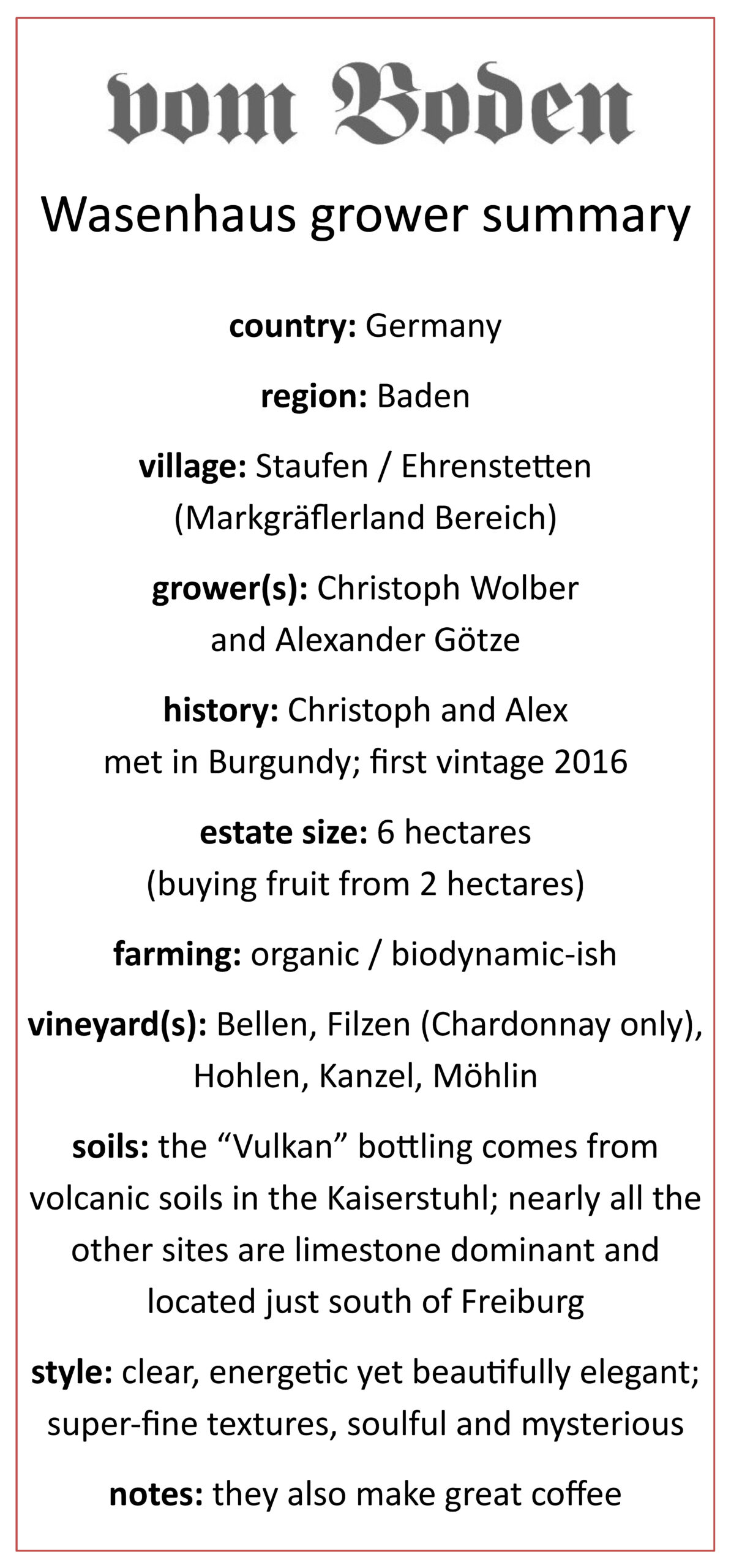 They are currently farming around six hectares and purchasing fruit from about two extra hectares. If you’d like to be put on the mailing list to be alerted to when we receive any Wasenhaus wines, please email us at info at vomboden dot com.