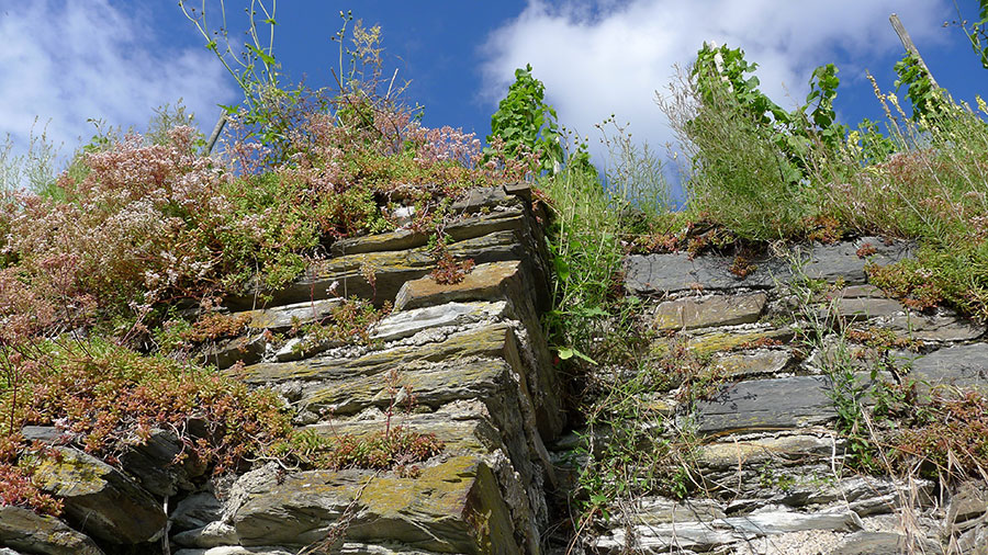 The simple truth seems to be that in the post-war period, with its trend toward mechanization, these terraced, craggy and ornery vineyards fell in status; they were largely abandoned. They were simply too hard, too expensive to farm. Yet the fact that these vineyards fell into obscurity for this period isn’t entirely a bad thing. Because this area was so poor, because it was overlooked, the vineyards here have simply not seen the “modernization” that many sites in the Mosel have. This, in turn, means that these cliff-vineyards still have their jutting, ladder-like terraces and on these terraces, they have many, very old un-grafted vines – far, far older than most of the famous sites which were largely replanted with more modern clones through the 1960s, 1970s and beyond.