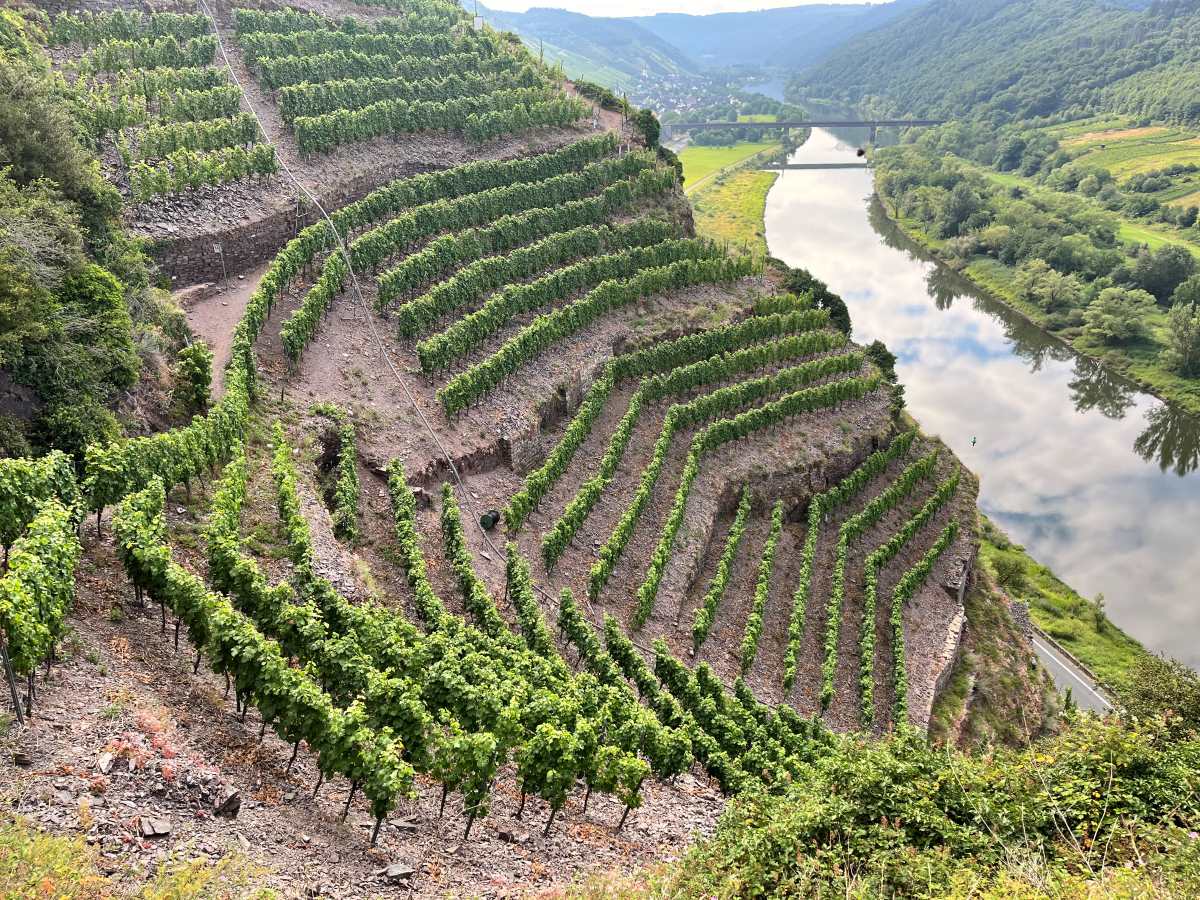 The depth and narrowness of the Moselle Valley is both a limiting factor and its saving grace. The narrowness and severity of the valley (see the picture below) means that the steep slopes are perfectly angled to catch the sunlight. But, historically only the most perfectly exposed sites, those facing due south, could achieve proper ripeness.