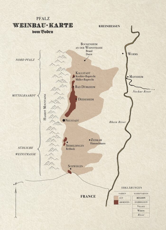 The Pfalz is a tract of land running north from Alsace, along the western side of the Rhein, ending at the Rheinhessen around Worms — a total length of about 80 kilometers (50 miles). In a way, the Pfalz is a continuation of Alsace, with the most famous vineyards tucked into the east-facing slopes of the Vosges Mountains, which in Germany are called the Haardt Mountains. The southernmost town in the Pfalz, Schweigen, has vineyards that actually extend a little bit into France.