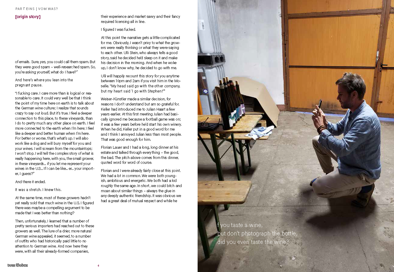 was first published in the fall of 2023, to celebrate our 10th anniversary. The book is exactly 190 pages and includes stories from the beginning of vom Boden, including our fears, philosophies and why it’s easier to get a colonoscopy than to sell wine in all fifty states. It also includes love letters to the wine regions of Germany (including the Moselle, Saar, Ruwer, Nahe, Rheingau, Rheinhessen, Pfalz, Baden, Franken and Württemberg), maps, tons of color photos, a grape index and so much more!